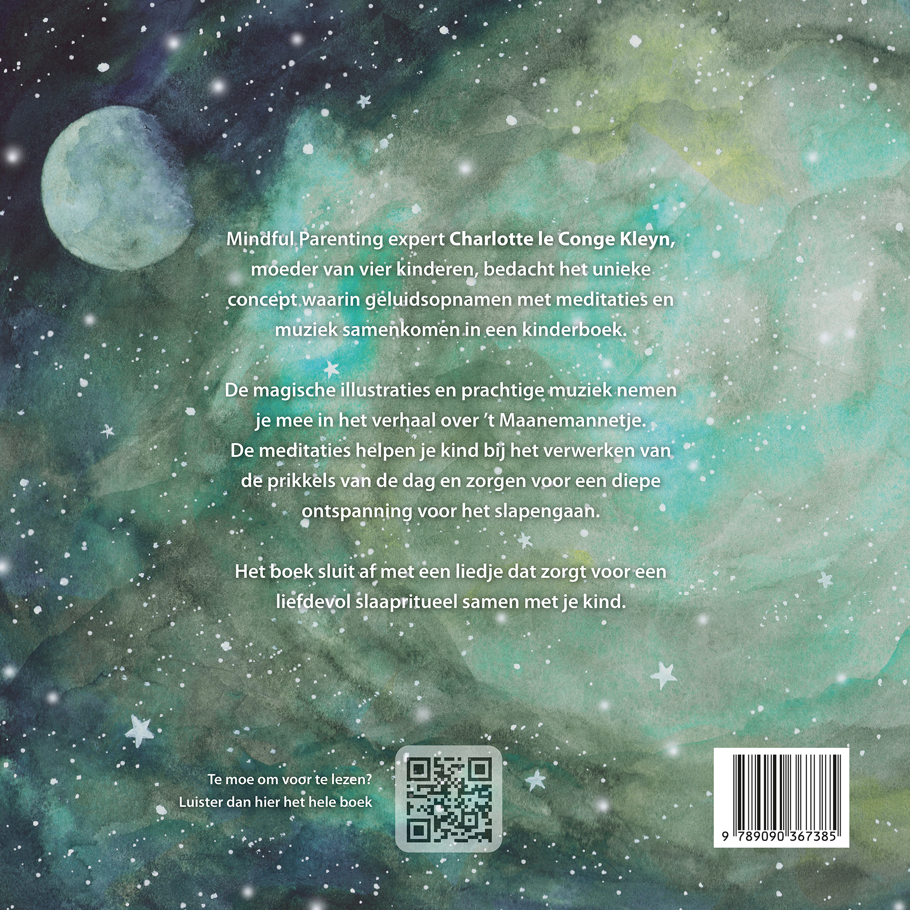 Dit kinderboek is uniek omdat het geluidsopnamen met meditaties voor kinderen bevat. In het boek zijn een aantal QR codes verwerkt aan de hand waarvan je gedurende het verhaal steeds een uitstapje kunt maken naar een bijpassende meditatie. De meditaties helpen kinderen bij prikkelverwerking en zorgen voor een diepe ontspanning. Het boek sluit af met een slaapliedje waardoor een liefdevol slaapritueel tussen ouder en kind wordt gecreëerd.